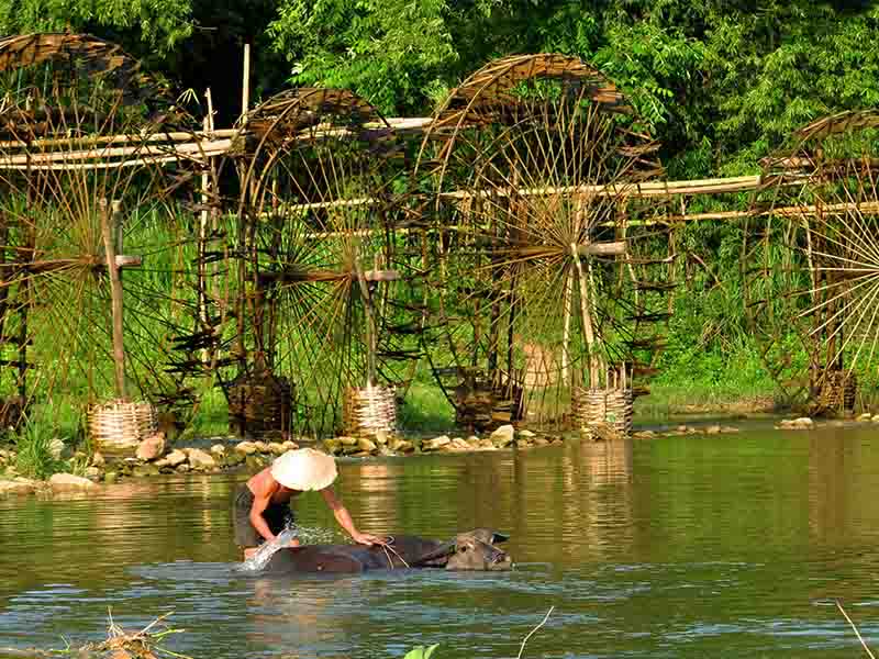 12:00 :You will be transffed to a suspension bridge over the Cham River, where you begin your walk in search of stunning water wheels. Get up close to each wheel and discover how water is moved from river to handmade bamboo aqueducts via simple constructions of all sizes.